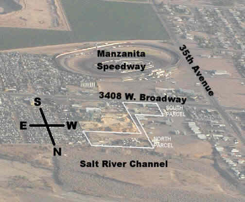 looking Southwest This photo shows the property (outlined in white) and the surrounding area. Since the picture is taken toward the South, the North Parcel is toward the bottom of the picture and the South Parcel is toward the top. This photo was taken in August 2002. |