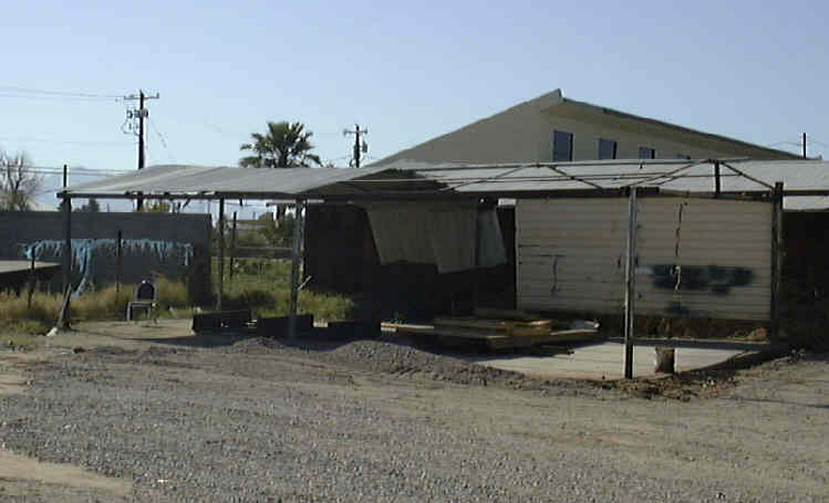 View shows wood-frame building, steel garage (Unit G2) and double-wide trailer (Unit G1); looking Northwest. |