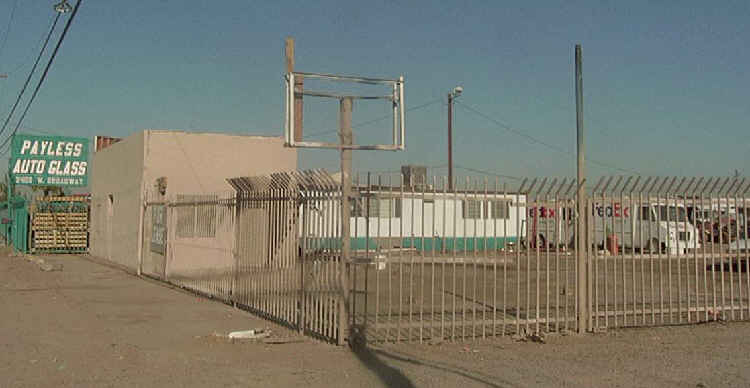 Small building and fenced yard This unit is rectangular, 73' x 80' ~5840 square feet The unit has 73' of frontage on W. Broadway and is accessed directly from the street. The improvements on this unit include concrete pavement and a wood-frame stucco building with a tar paper roof. The building is approximately 31 x 14 feet outside dimensions (434 sf +/-). There is a canopy over an area adjacent to the building (not shown). The building includes a bathroom. There is water, electricity, a telephone hookup and connection to the septic system. The yard is fenced. |